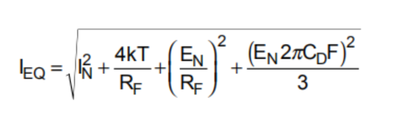 If the frequency band limit of the total output noise is less than the feedback pole frequency (1/RFCF), a very simple expression for the equivalent input noise current can be derived as: