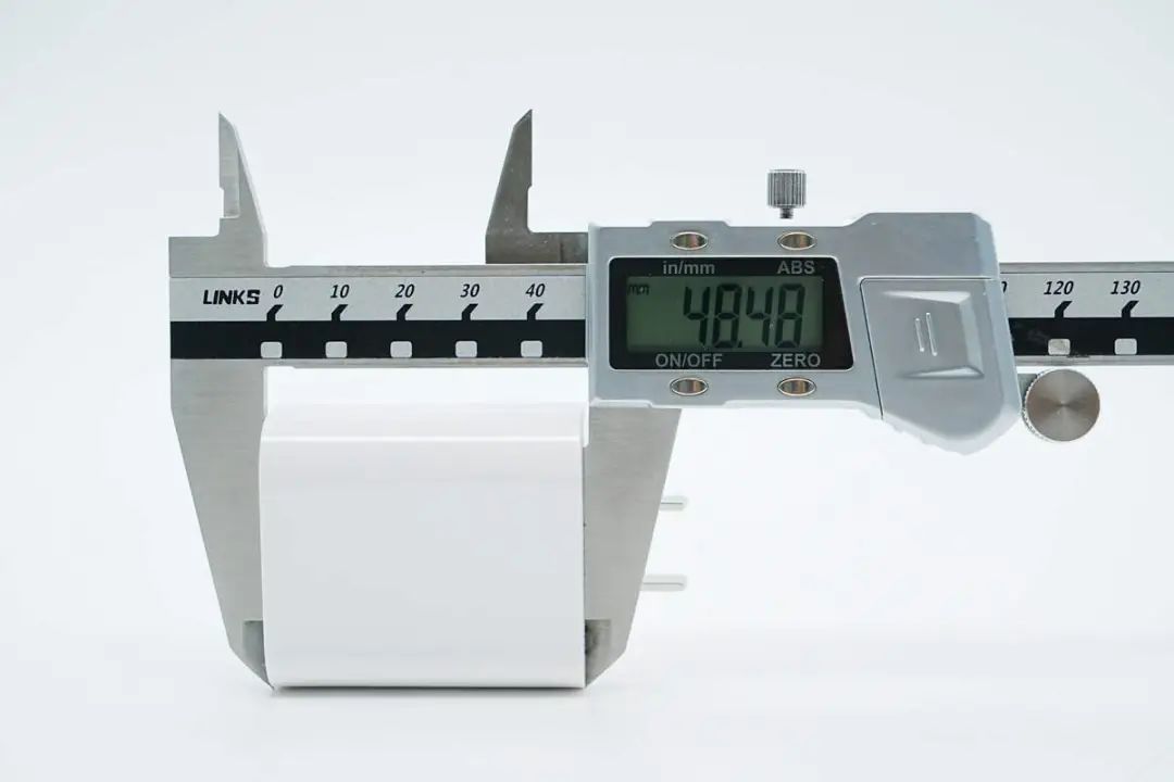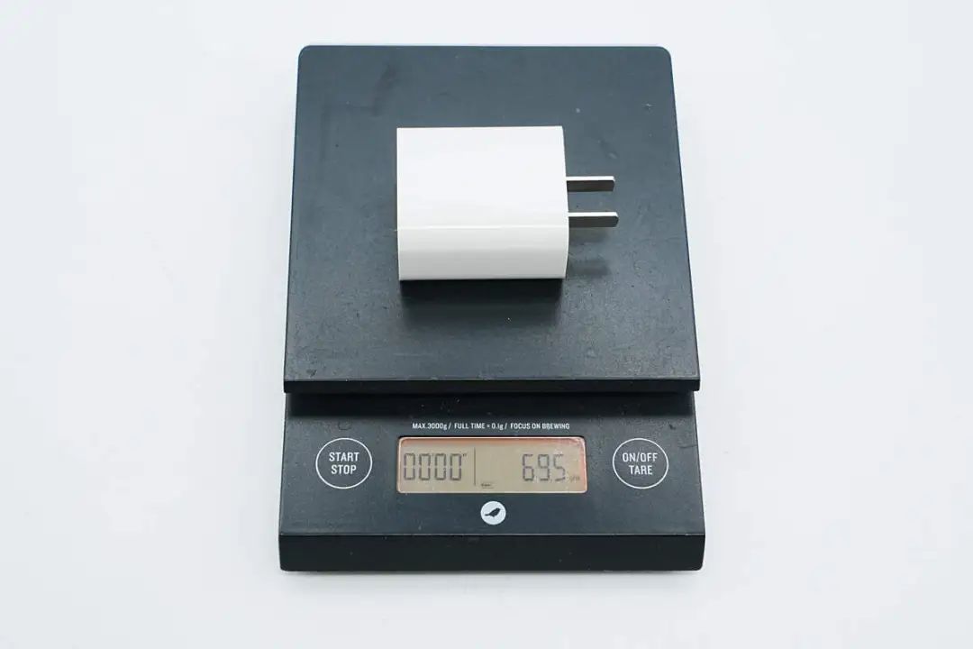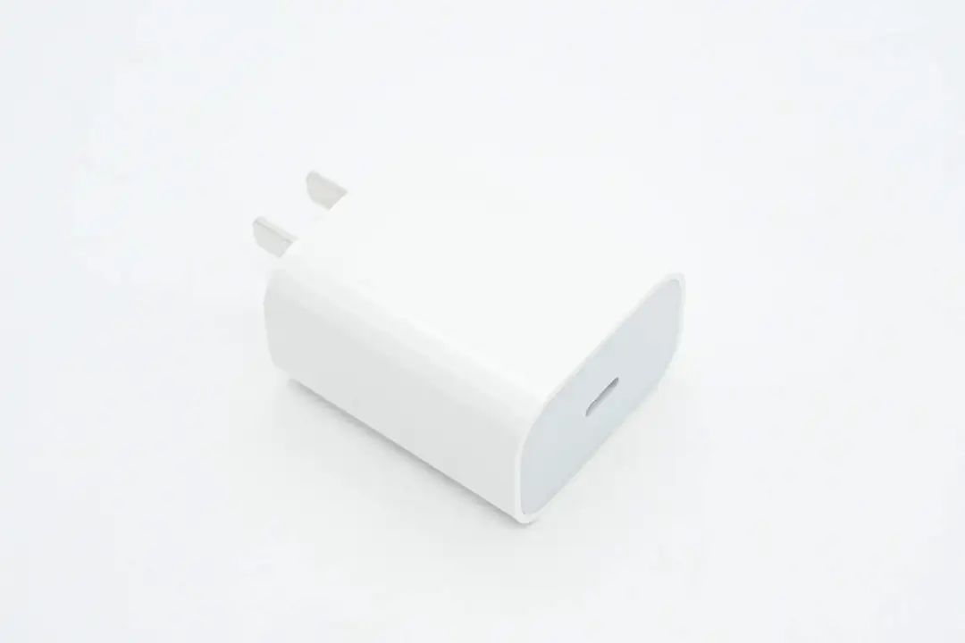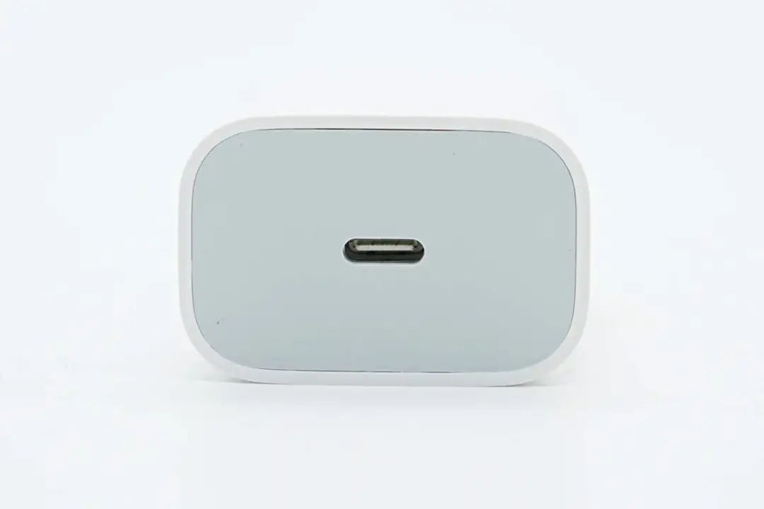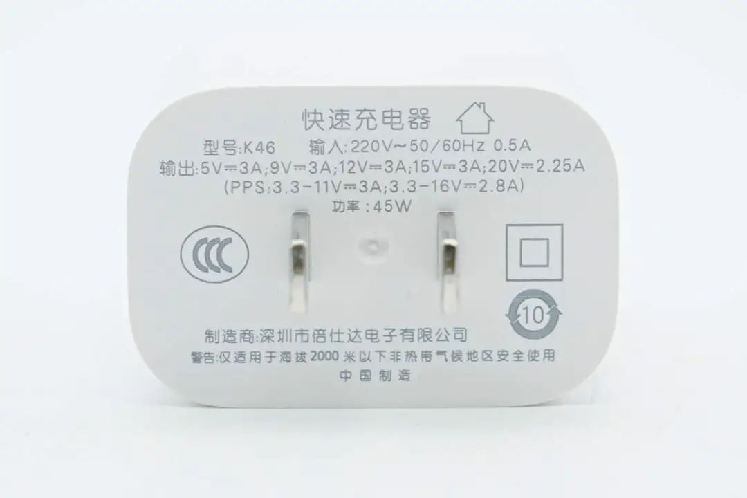 The Beishida charger adopts the same appearance style design as the Apple 20W fast charger. The input end and side of the body are integrated with a white shell, with a high gloss surface treatment. At the same time, the transition on both sides is rounded, and the output end shell is gray in color.