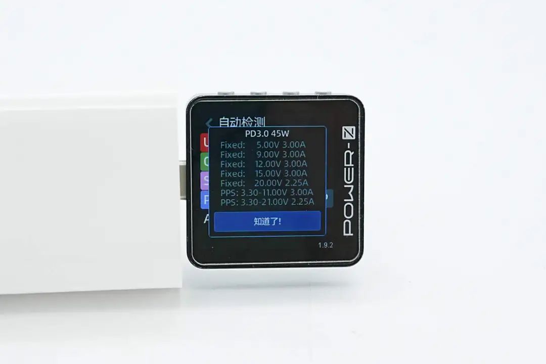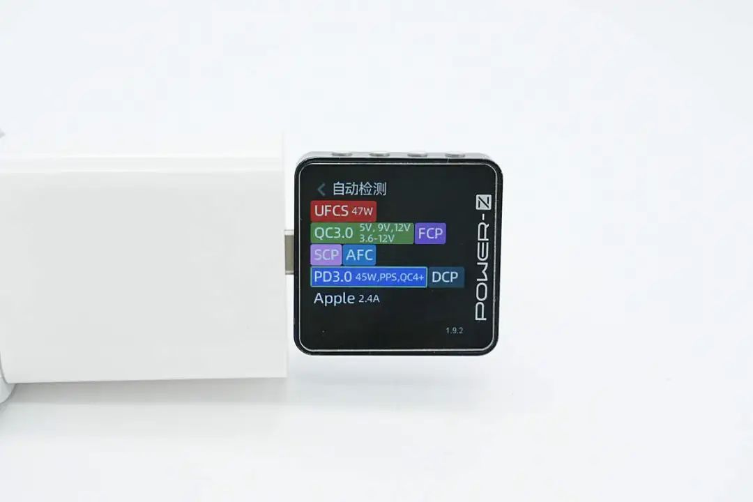 Using ChargerLAB POWER-Z KM003C, it was measured that the USB-C port of the charger supports UFCS, QC3.0/4+, FCP, SCP, AFC, PD3.0, PPS, DCP, and Apple 2.4A charging protocols.