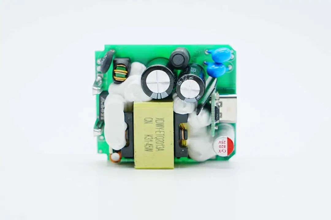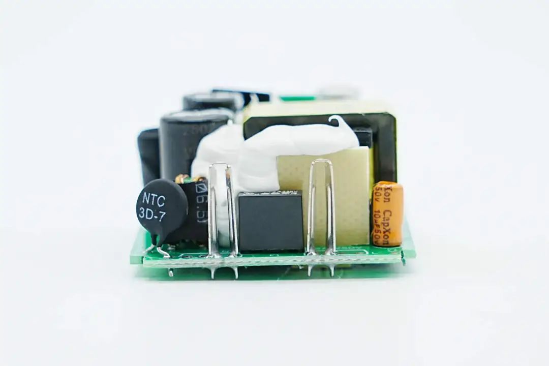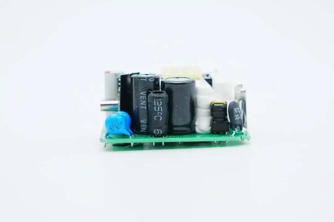 On one side of the board, there are common mode inductors, I-shaped inductors, two high-voltage filtering electrolytic capacitors, and a blue Y capacitor.