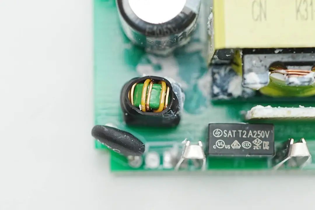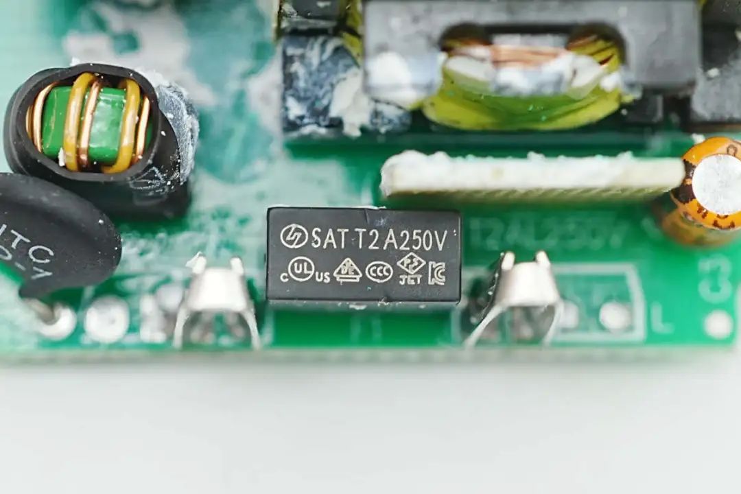 Removing the thermal pad, the front of the motherboard is equipped with delay fuses, common mode inductors, high-voltage filtering electrolytic capacitors, transformers, output filtering solid-state capacitors, and other devices, which are reinforced with glue. At the same time, the primary stage is equipped with Maillard isolation insulation.