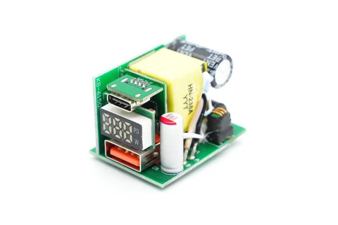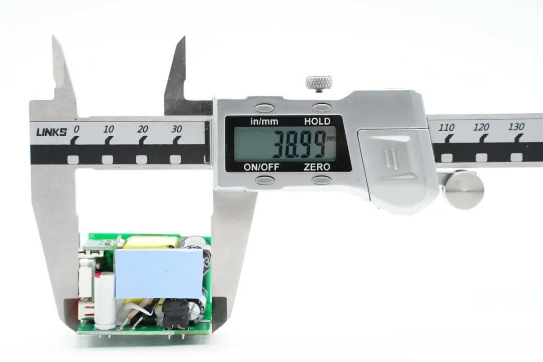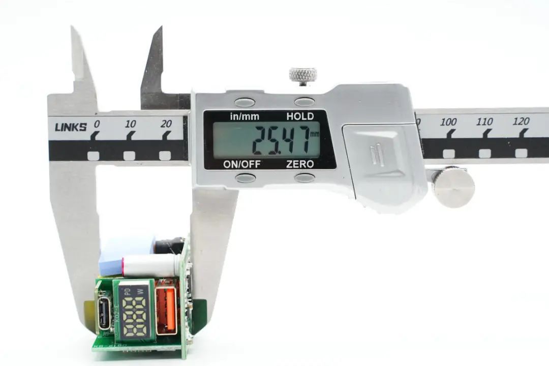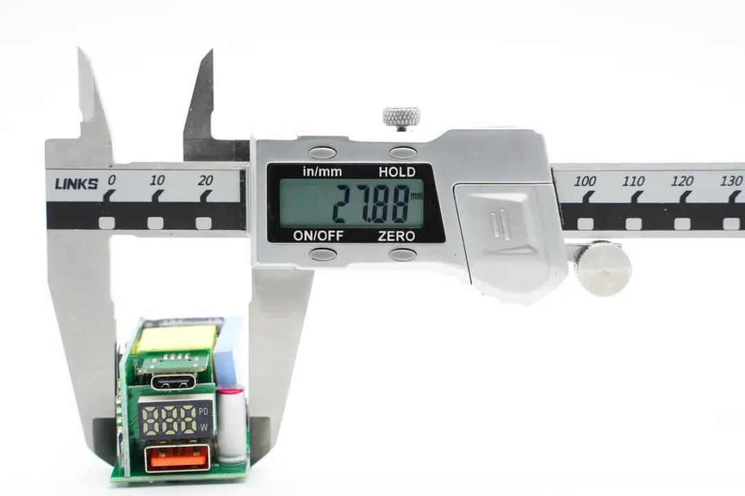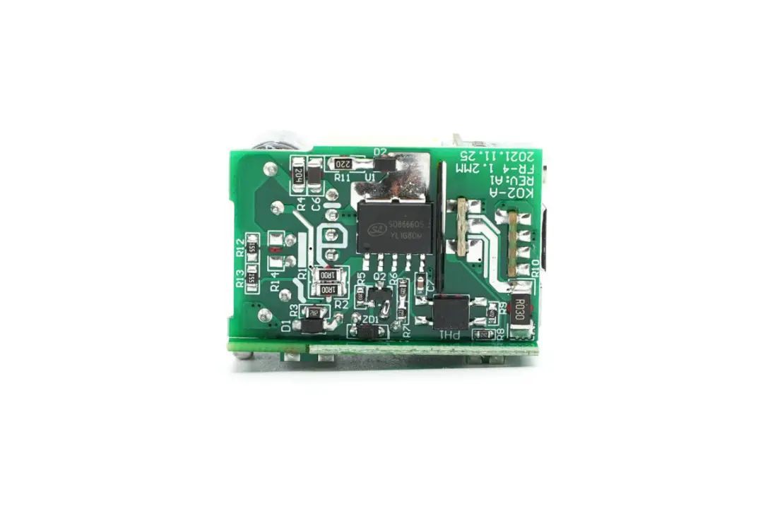 The PCBA module is designed by stacking multiple small boards, with one board vertically soldered on the side. The two USB sockets and digital display screen at the output end are soldered on three small boards respectively.