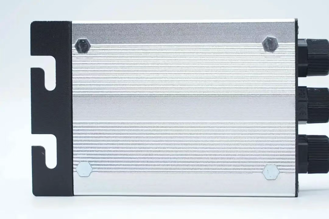 Charging Head Network purchased a solar mini grid-connected inverter, manufactured by Dongguan Xineng Technology Co., Ltd., with the model number GMI180L. The inverter features an aluminum alloy casing for efficient heat dissipation. One side of the housing is equipped with a mounting hook and a working indicator light, while the other side has terminal blocks. The AC output uses dedicated terminals, and the DC input employs MC4 connectors.