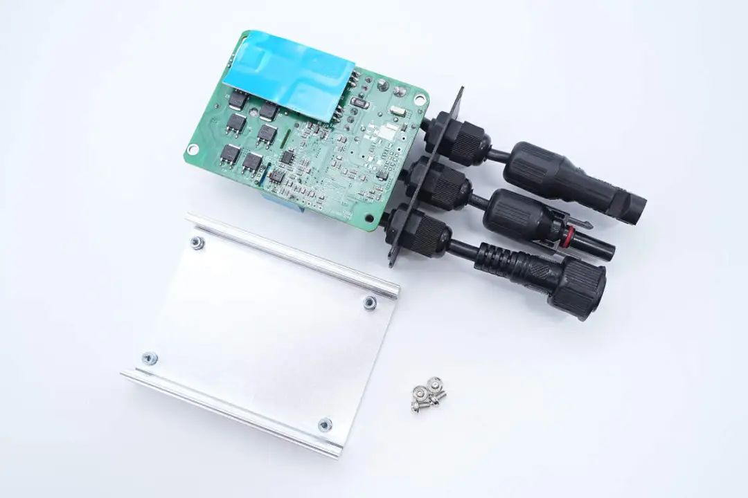 The inverter has a rated output voltage of 230VAC, supports an output voltage range of 180-280V, and is compatible with 50/60Hz frequencies. The DC input voltage range is 10.8-30V, with a maximum input power of 180W and a rated output power of 150W. Below is the disassembly of this solar micro grid-connected inverter, showcasing its internal design and component materials.