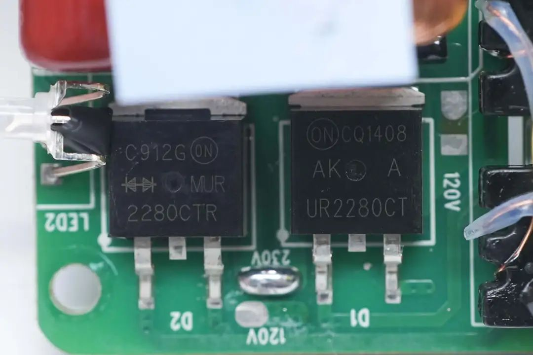 Two rectifier tubes are silk screened with MUR2280CTR and UR2280CT models, with specifications of 22A 800V. They are fast recovery diodes and packaged in TO-263.