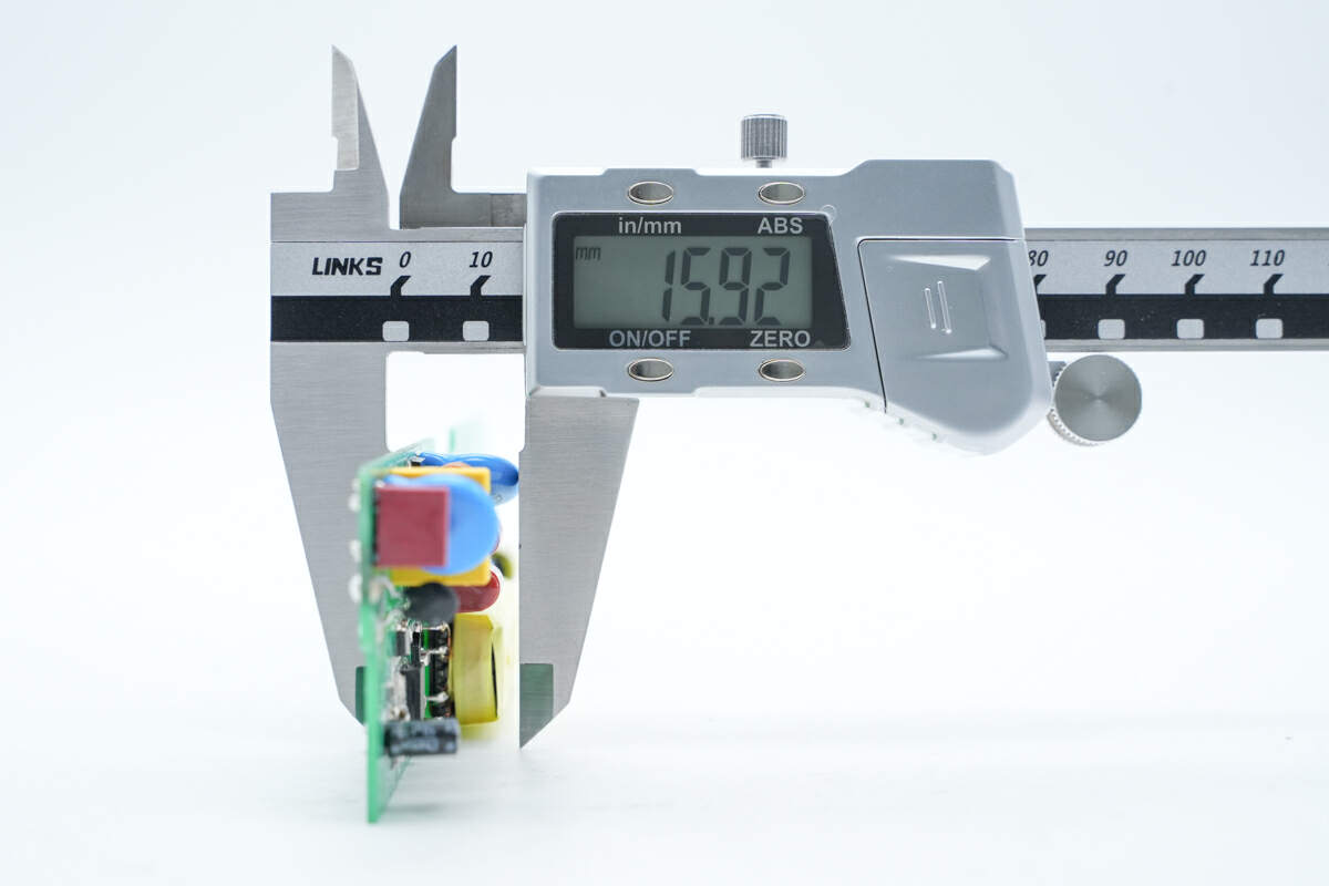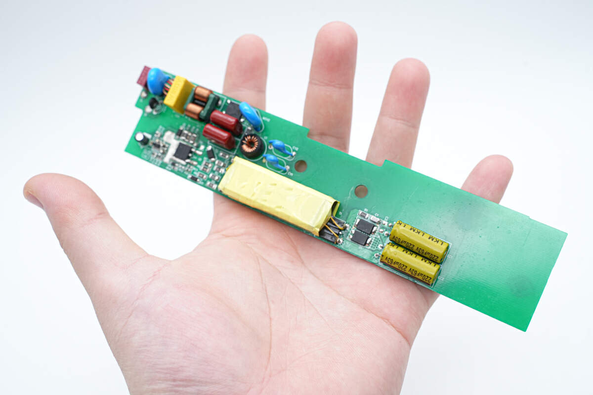 The Nenghua 45W high PF gallium nitride LED driver power DEMO adopts a flat and ultra-thin design, which is compatible with the ultra-thin design requirements of LED cabinet lights. The gallium nitride AC-DC part is very compact, and the blank PCB part can reserve sufficient space for the later DC-DC flicker circuit and DALI intelligent dimming circuit. The overall thickness control of the DEMO is excellent.