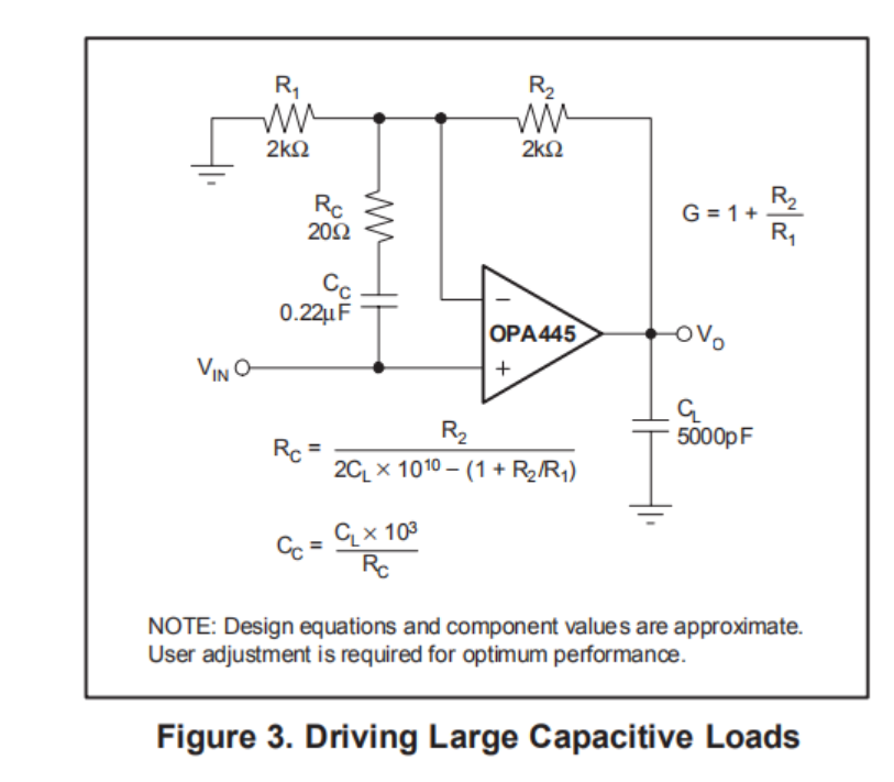 The dynamic characteristics of OPA445 have been optimized for common gain, diode load, and operating conditions. The combination of low closed-loop gain and capacitive load can reduce phase margin and may lead to gain peaks or oscillations. Figure 3 shows a circuit that maintains phase margin under capacitive load. The circuit will not experience voltage drop due to load current; However, the input impedance will decrease at high frequencies. The reference application announcement SBOA015 can be downloaded from the www.ti.com website, which provides a detailed introduction to analysis techniques and application circuits.diode