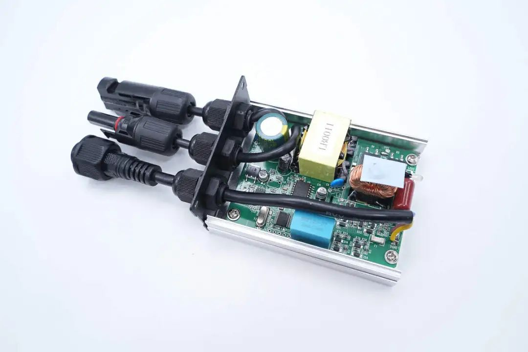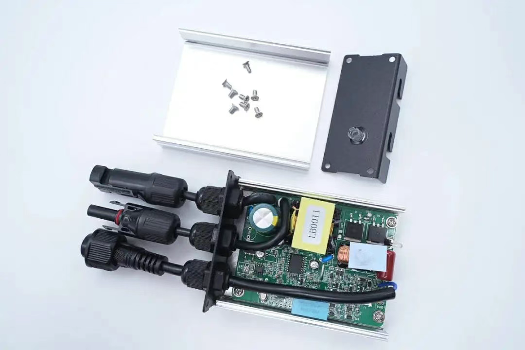 The inverter has a rated output voltage of 230VAC, supports an output voltage range of 180-280V, and is compatible with 50/60Hz frequencies. The DC input voltage range is 10.8-30V, with a maximum input power of 180W and a rated output power of 150W. Below is the disassembly of this solar micro grid-connected inverter, showcasing its internal design and component materials.