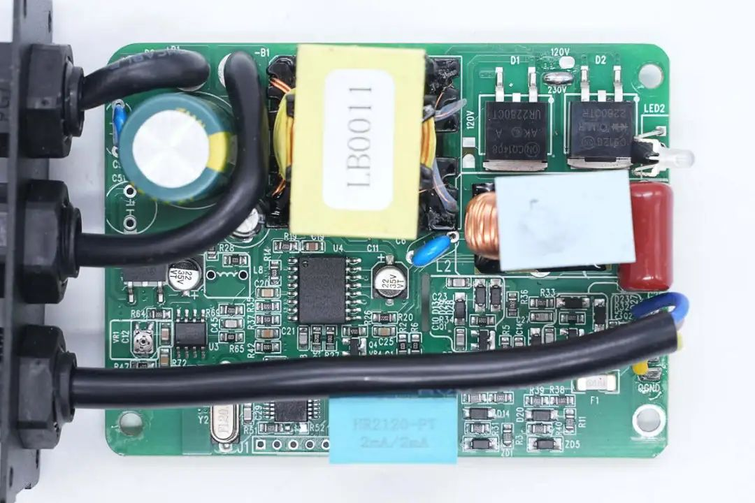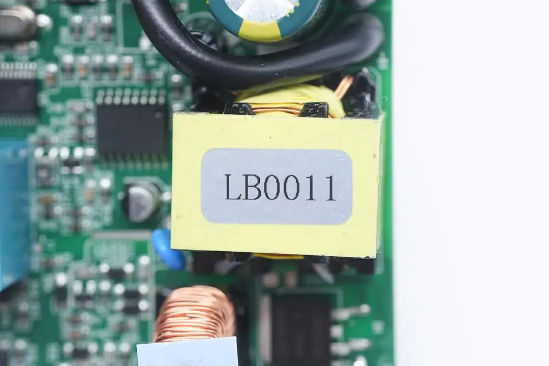 Front view of PCBA module, with a filter electrolytic capacitor soldered in the upper left corner and a transformer, rectifier diode, filter inductor, and filter capacitor soldered in the right corner. Weld a three terminal voltage regulator chip and operational amplifier below the electrolytic capacitor, MCU, Isolate driver chips, transformers, and other components.