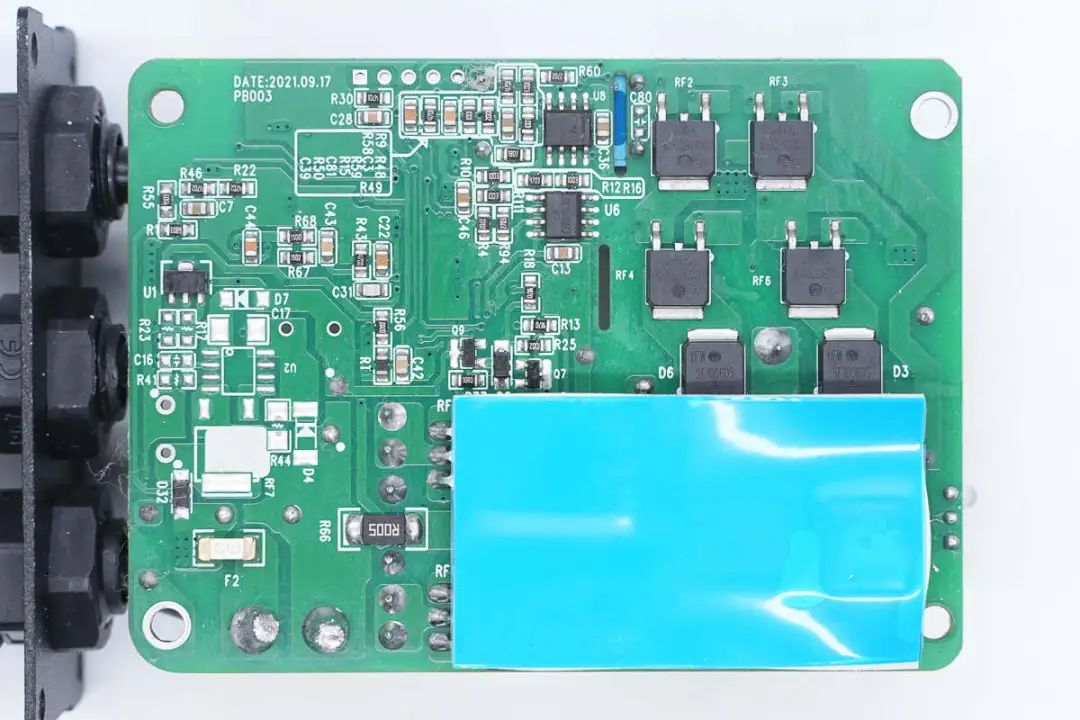 On the back of the PCBA module, there is a blue thermal pad located at the corresponding power device position.