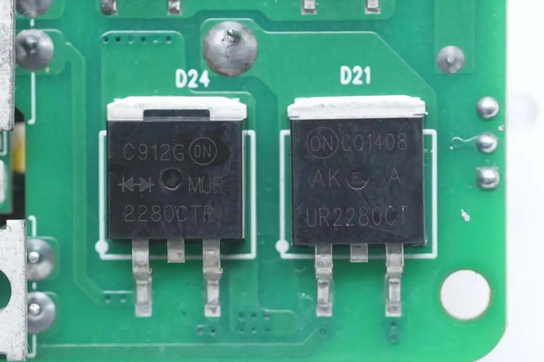 Two rectifier tubes are silk screened with MUR2280CTR and UR2280CT models, with specifications of 22A 800V. They are fast recovery diodes and packaged in TO-263.